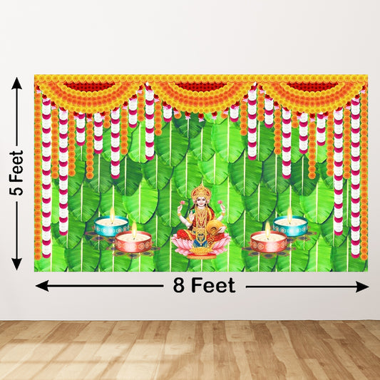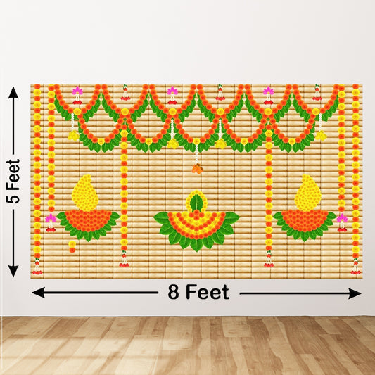 Weaved Coconut Leaf with Flower Goddess Laxmi Mata With Diya Lamp Design Backdrop for Pooja Decoration Traditional Deepavali Size (5x8) FT