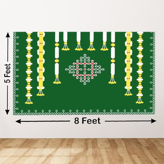 Garlands with Matuki and Krishnaji Design Backdrop Cloth for Pooja Decoration Traditional Background Size (5x8) FT