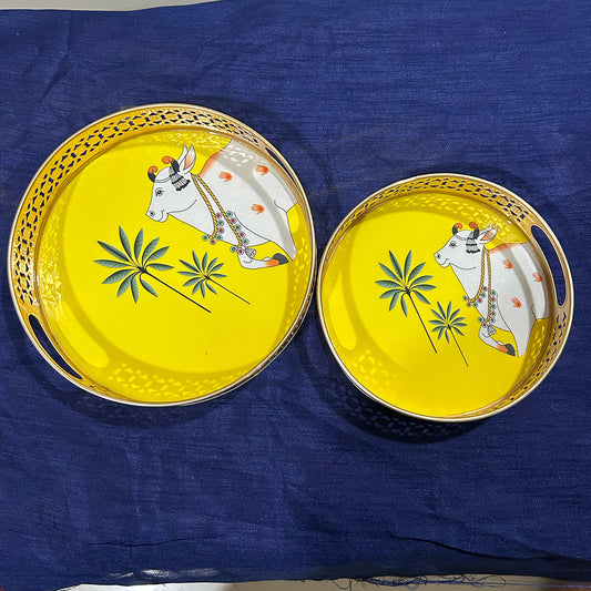 Circular Golden Tray With Pichwai Elephant Art Picture
