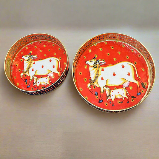 Red Circular Golden Tray With Pichwai Cow Art Picture