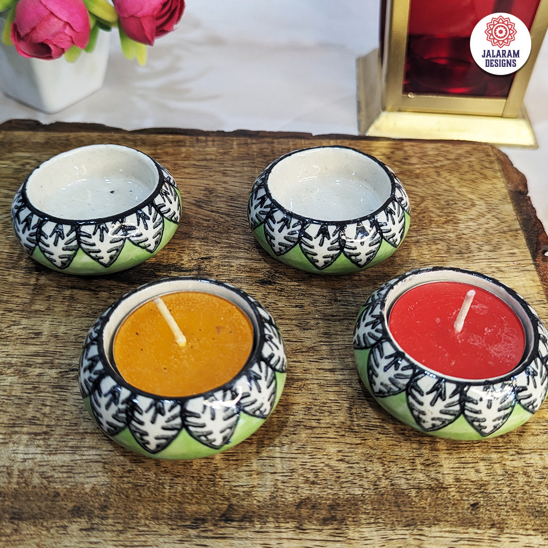 - Jalaram Designs Green Matki Pattern Blue Pottery Reusable Diyas are perfect for the festive season.