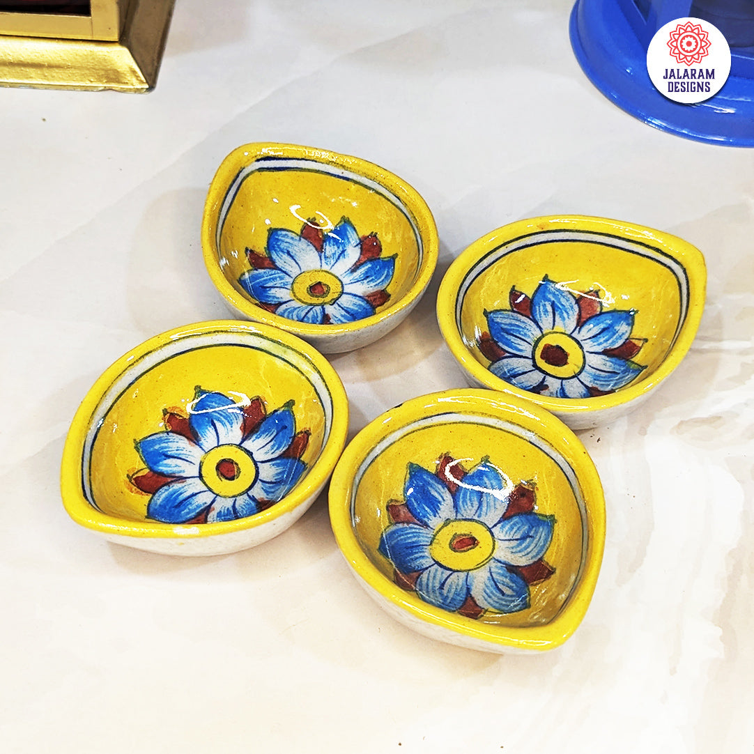 - Jalaram Designs Yellow Floral Blue Pottery Reusable Diyas are perfect for the festive season.