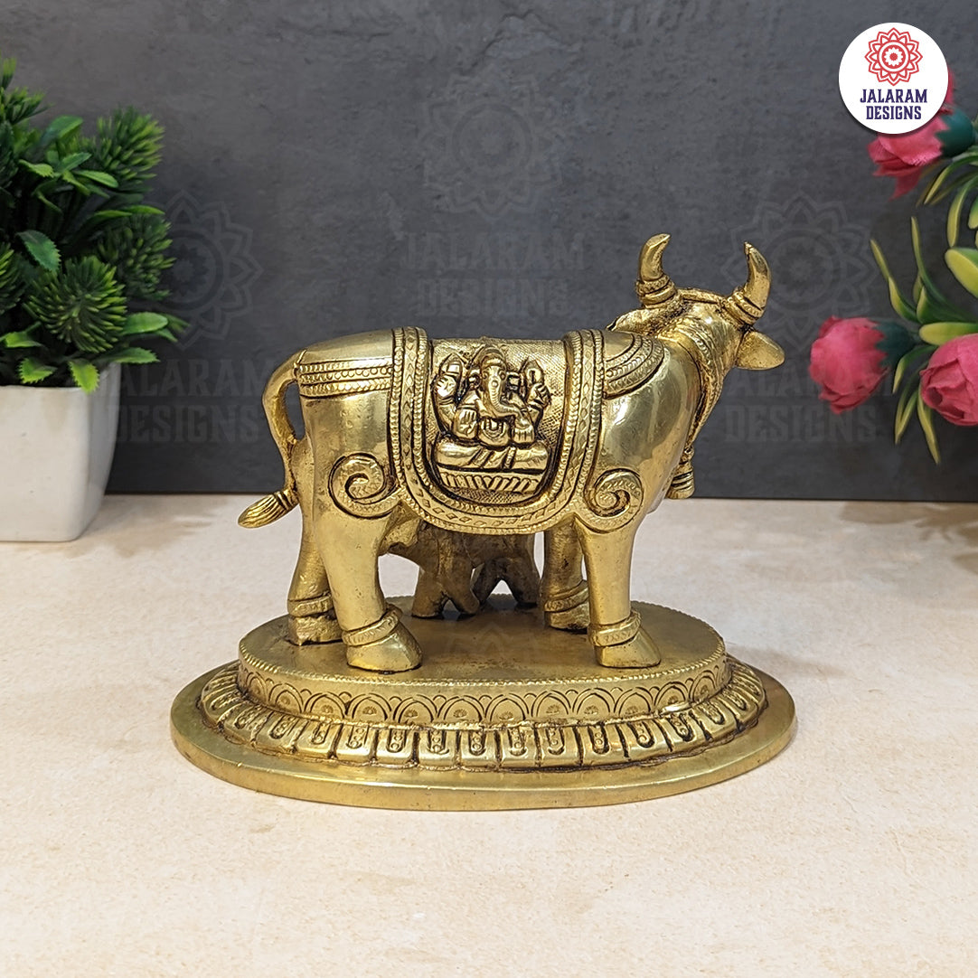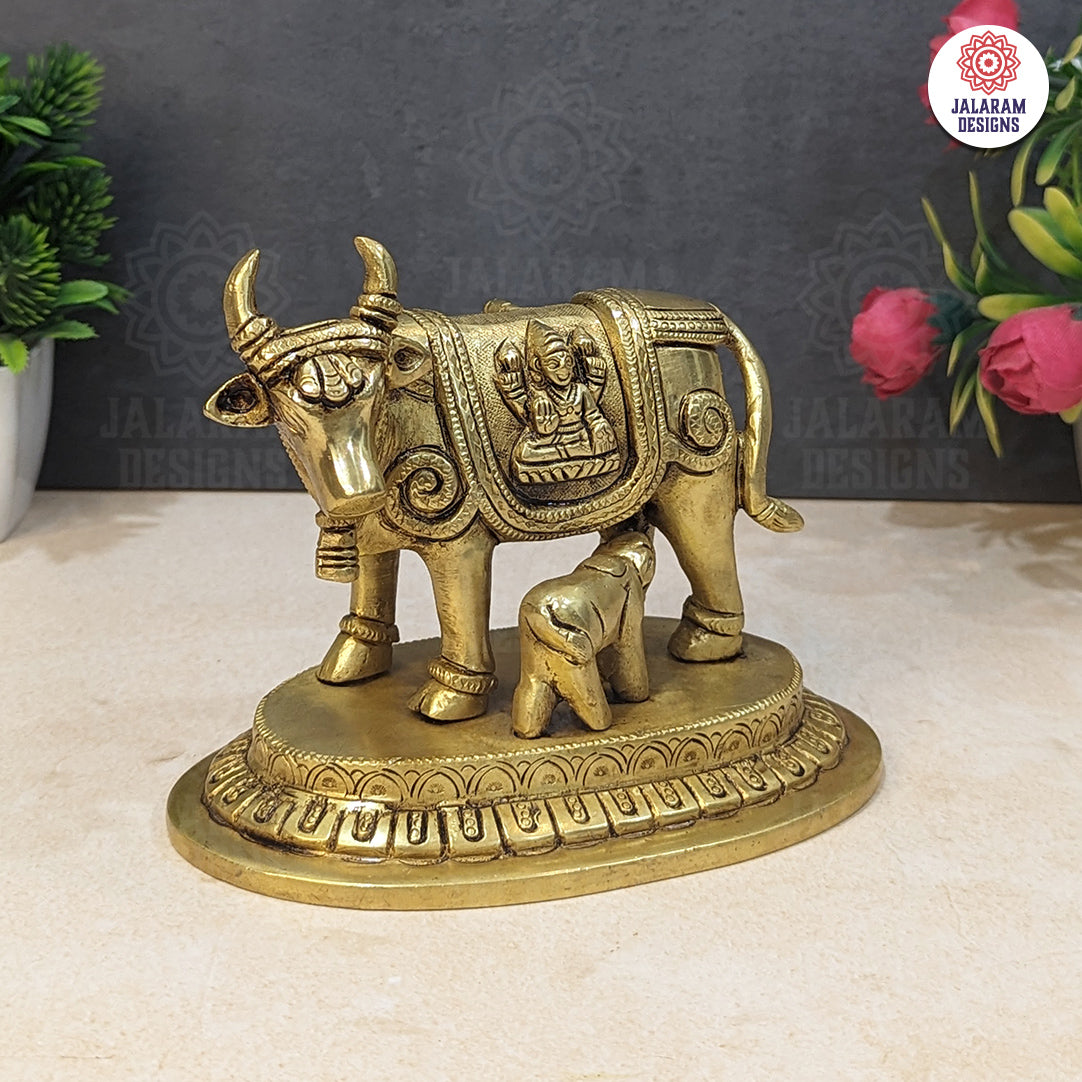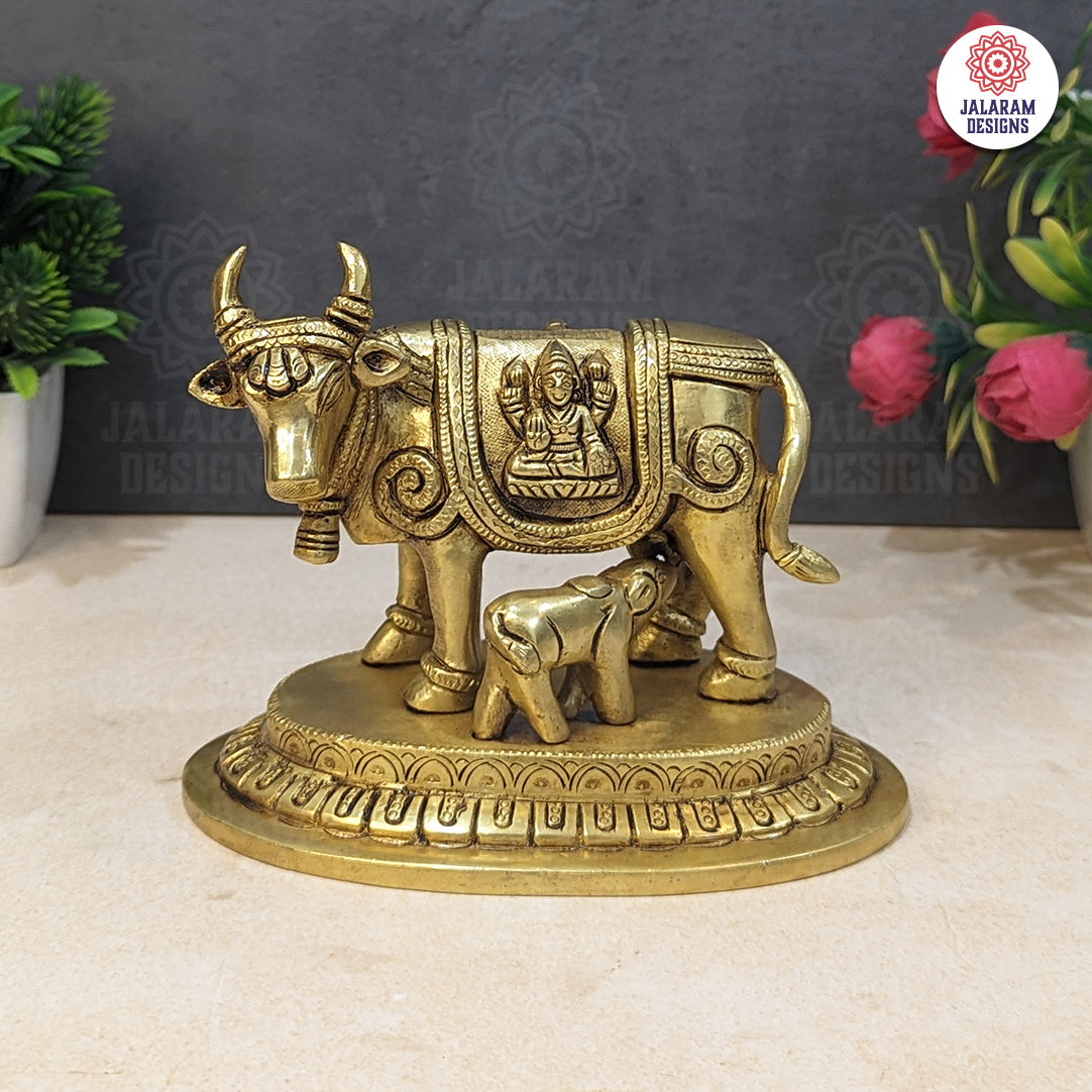 Brass Kamdhenu Cow Feeding Calf.The name Kamdhenu came from the Sanskrit root, "Kamaduha", which literally means, "the cow of plenty" and "the one through whom all desires are fulfilled. Bring in this brass idol from Jalaram Designs to cleanse the aura around you and to lead a life of contentment and purity.