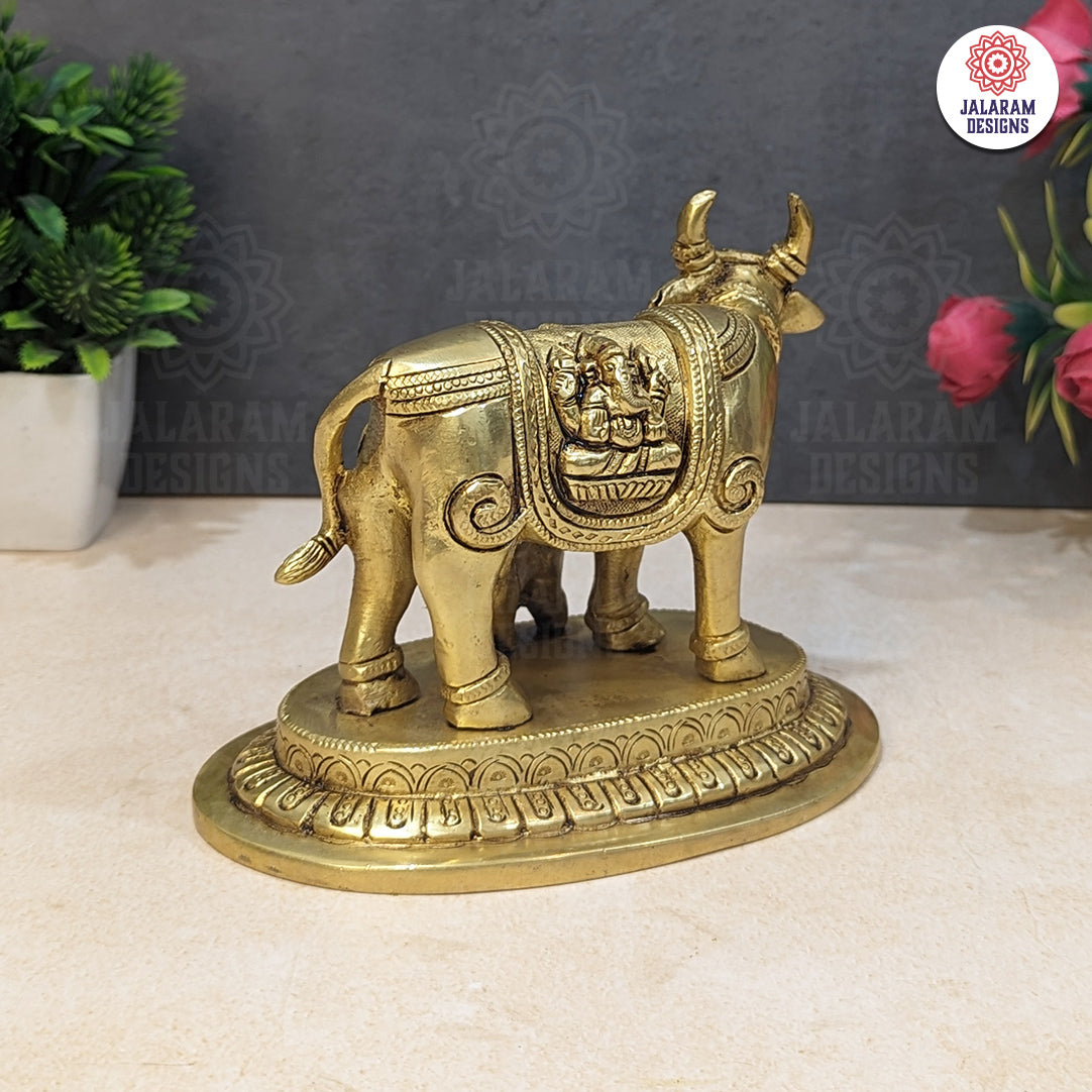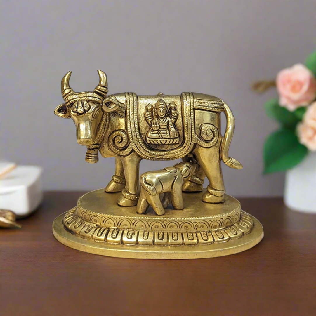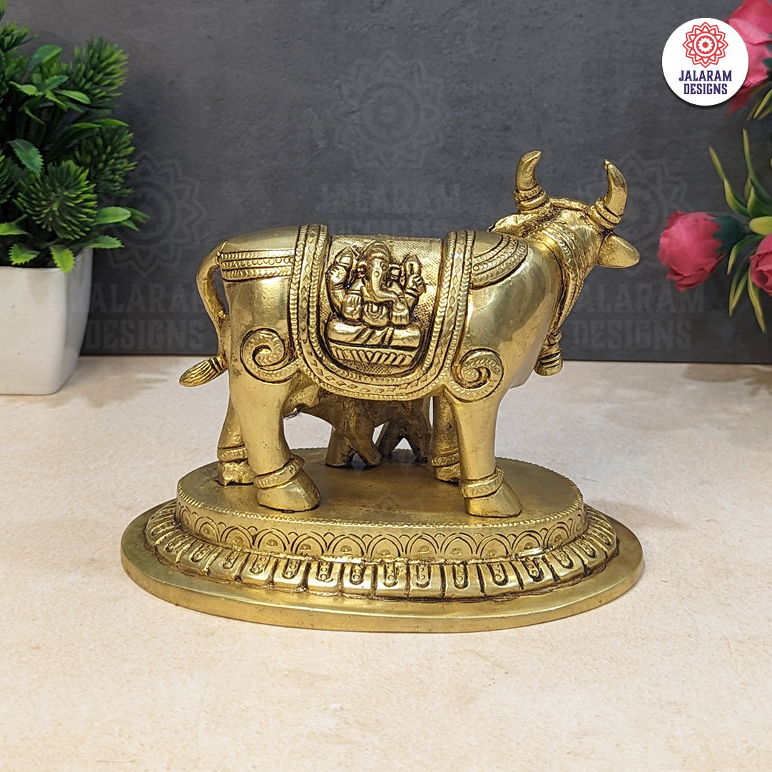 Brass Kamdhenu Cow Feeding Calf.The name Kamdhenu came from the Sanskrit root, "Kamaduha", which literally means, "the cow of plenty" and "the one through whom all desires are fulfilled. Bring in this brass idol from Jalaram Designs to cleanse the aura around you and to lead a life of contentment and purity.