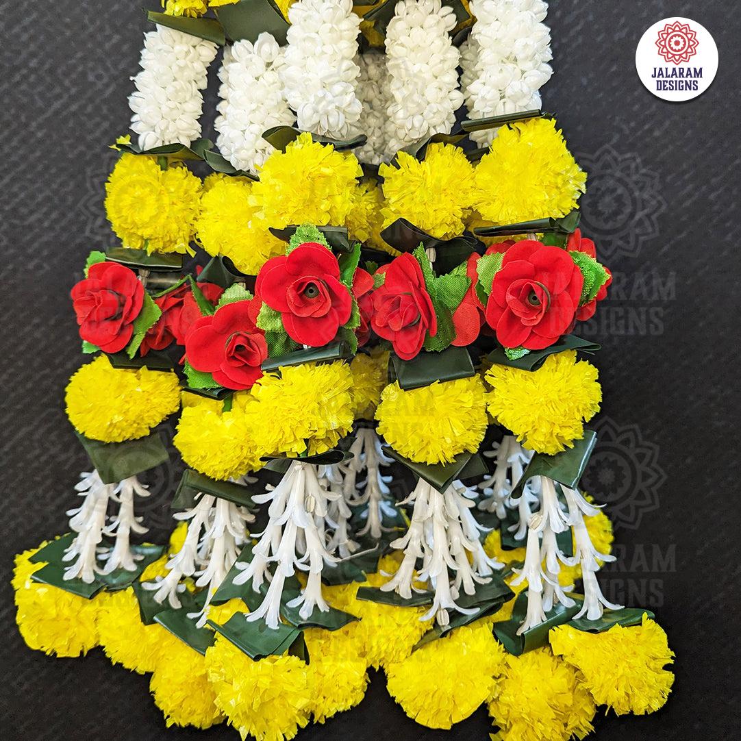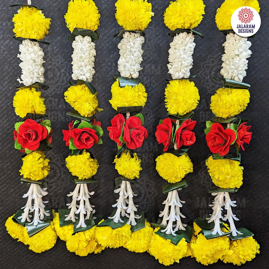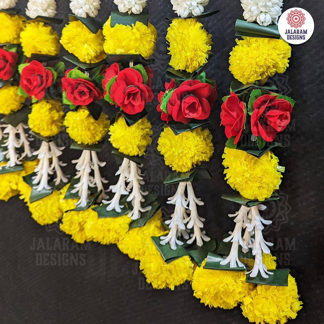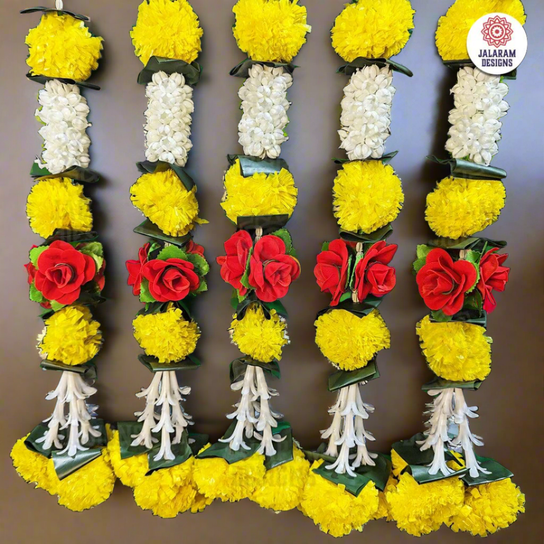The Decorative Marigold, Rajnigandha, and Rose Flower Garland Strings - Set of 2 enrich your area with cultural depth and visual beauty, whether adorning your house, honouring celebratory occasions, or creating an atmosphere of peace. Allow beautiful floral strands to create an atmosphere of positivity, tranquillity, and beauty—all made possible by Jalaram Designs, a Canadian Indian Decor Store.
