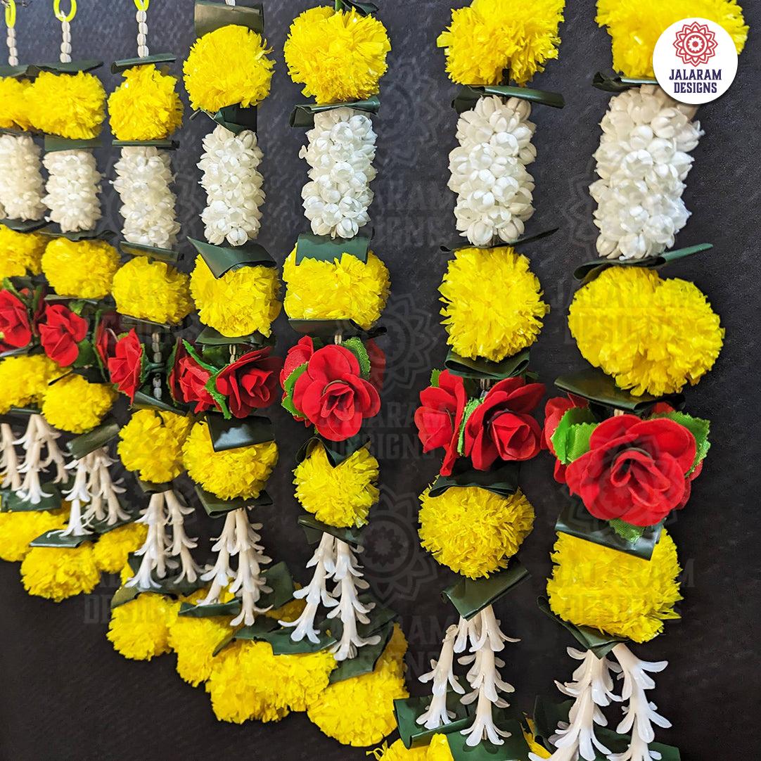 Enhance your decor with the stunning Decorative Marigold, Rajnigandha, and Rose Flower Garland Strings in a set of 2 from Jalaram Designs, a Canadian Indian Decor Store. Infuse your environment with marigold's vivid hues, Rajnigandha's (Tuberose's) relaxing aroma, and roses' timeless elegance.