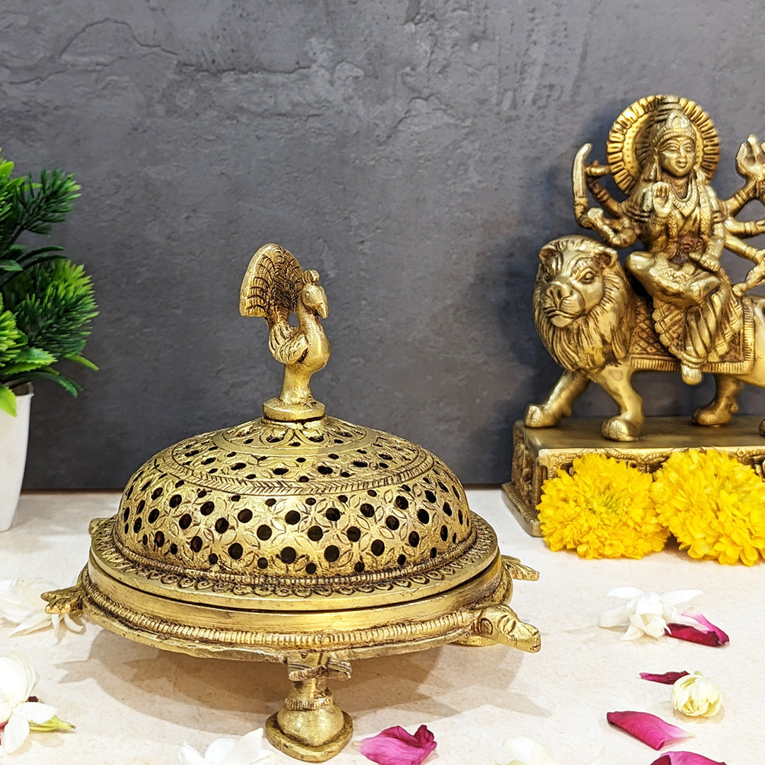 Introducing the exquisite Dhoop Dani, an enchanting incense burner exuding the rich essence of Indian traditions, now available at Jalaram Designs, the finest Indian Decor Store in Canada. Handcrafted with love, this metal Dhoop Dani boasts a mesmerizing golden hue that adds an aura of opulence to any space.
