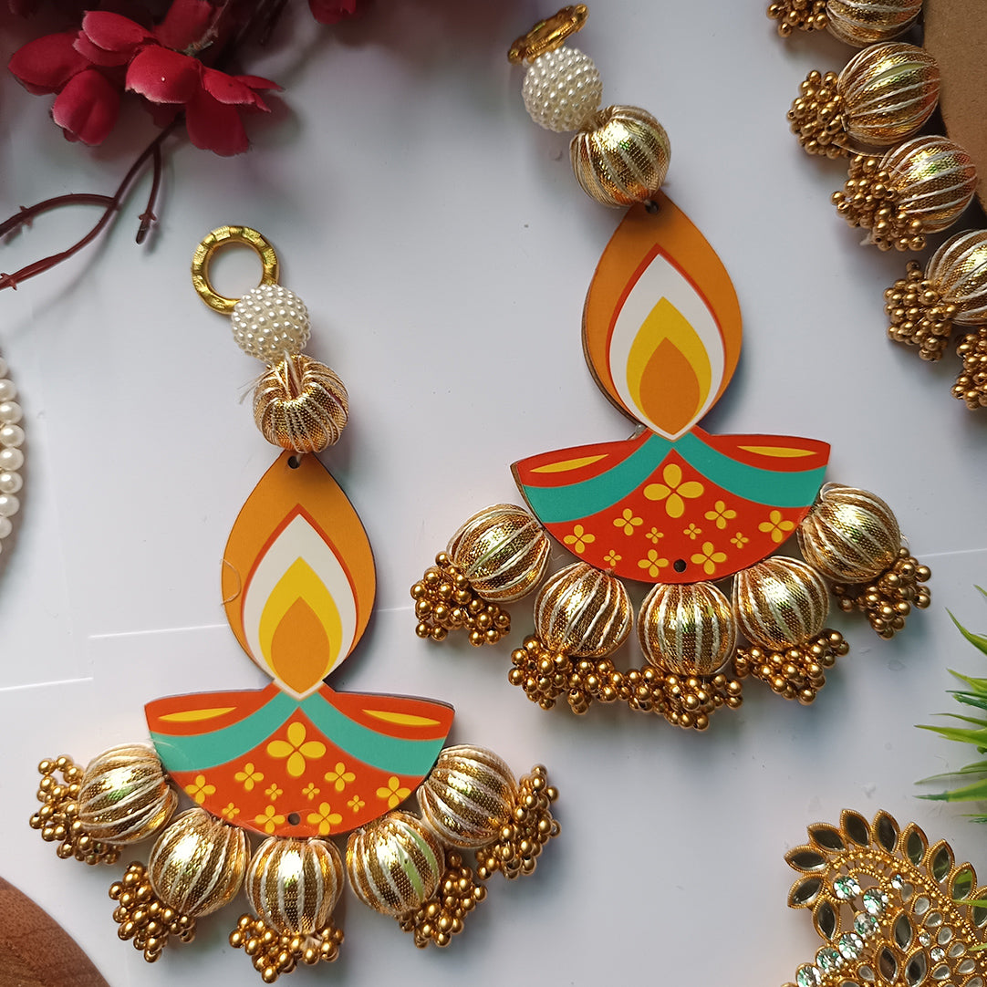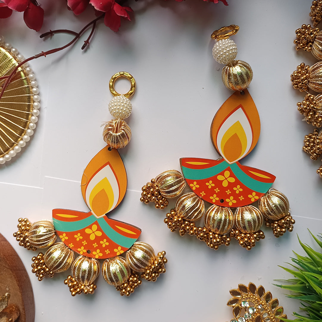 – Multicolored Diya wall hanging decor with gold bead danglers.