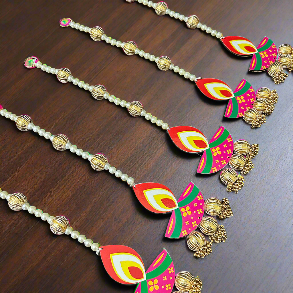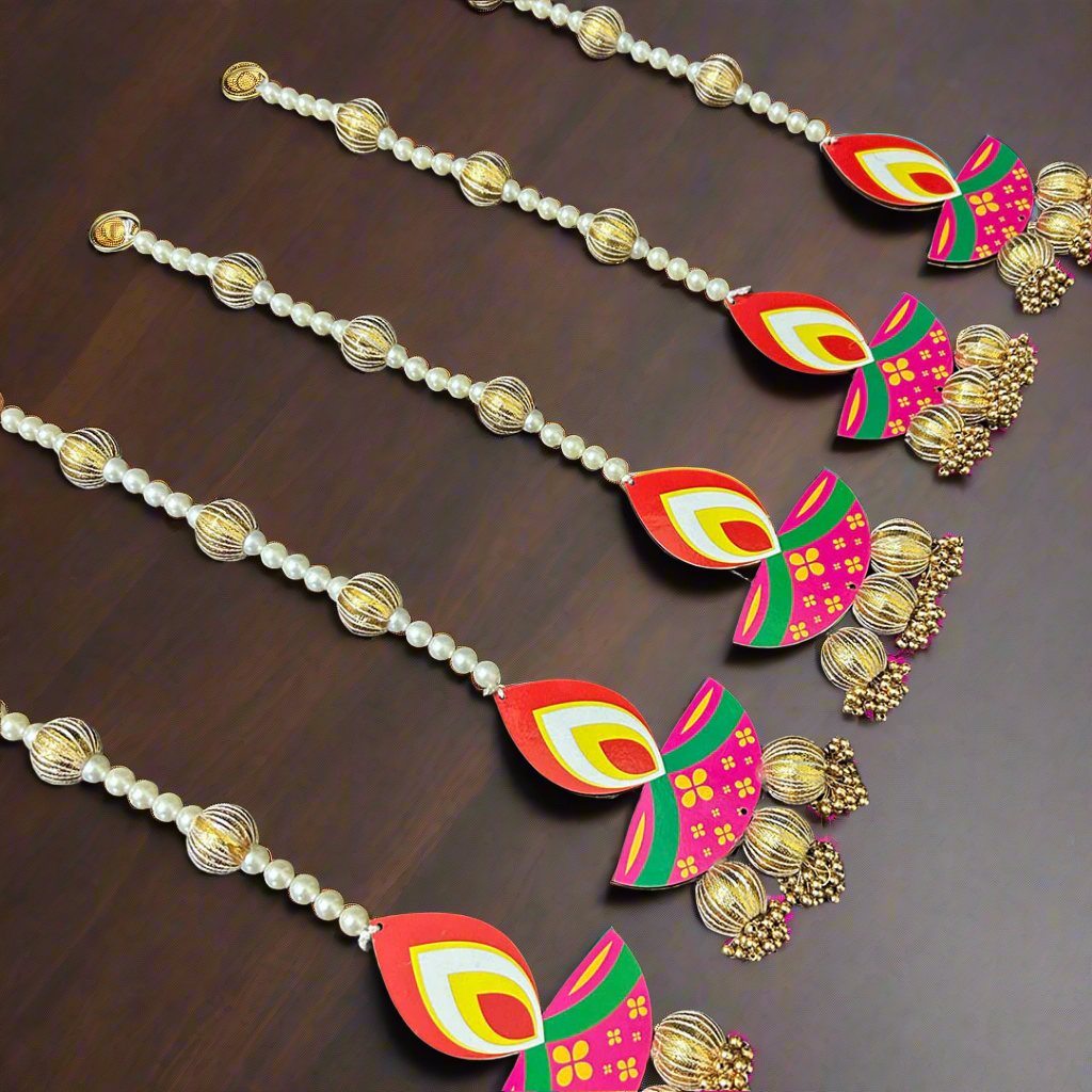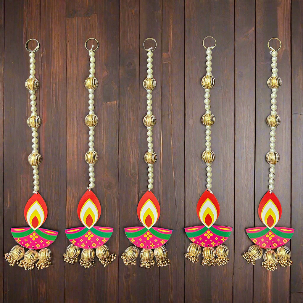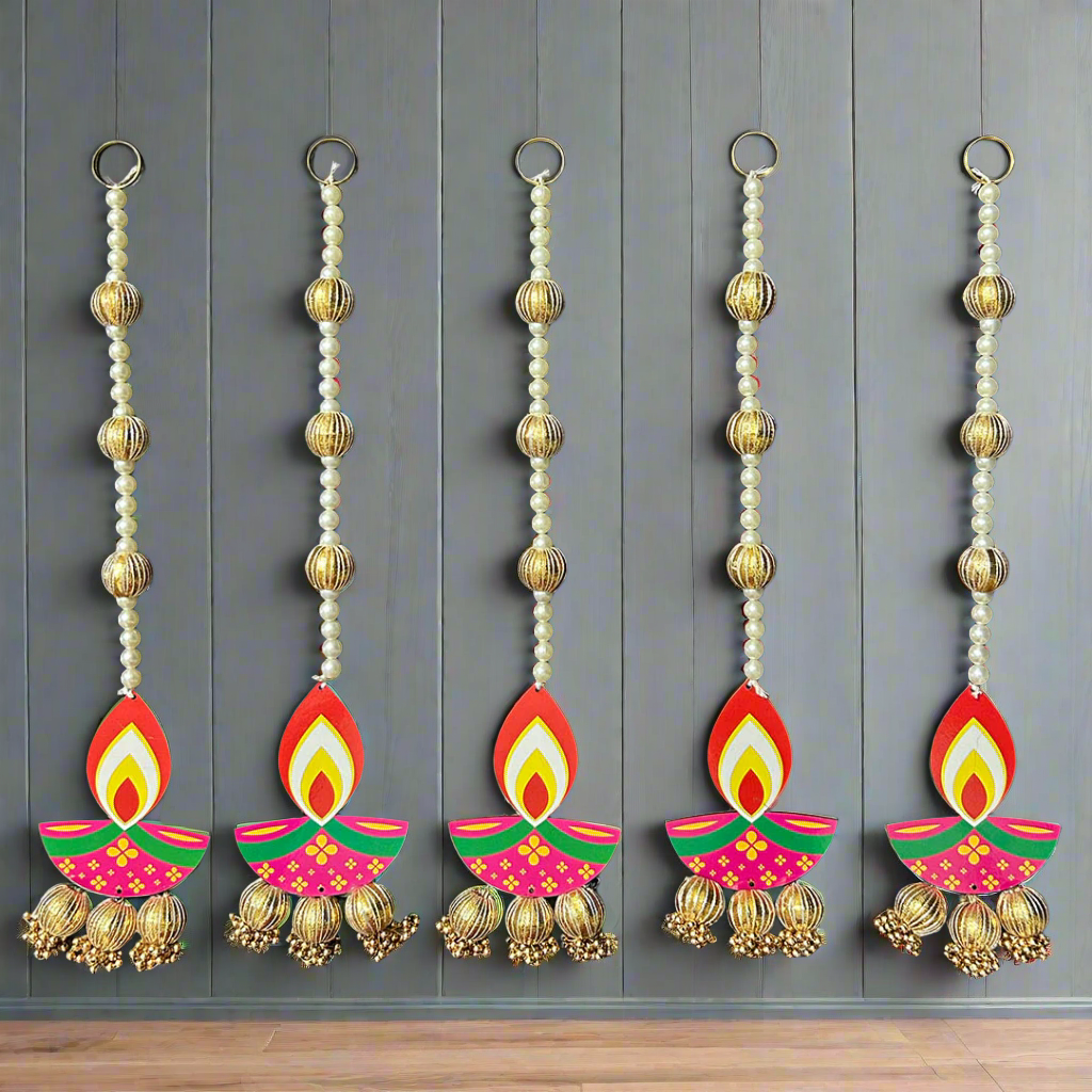 - Multicolored Diya wall hanging decor with gold bead danglers.