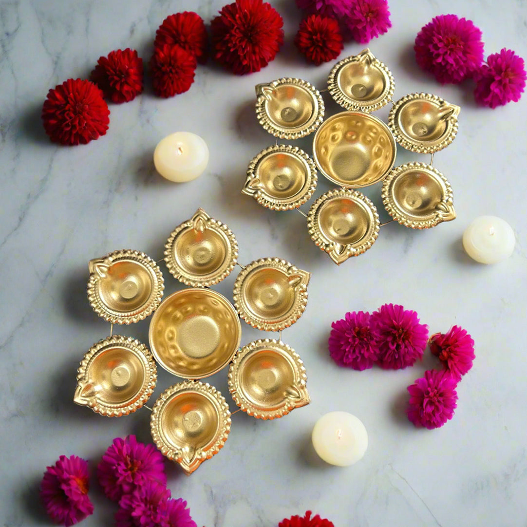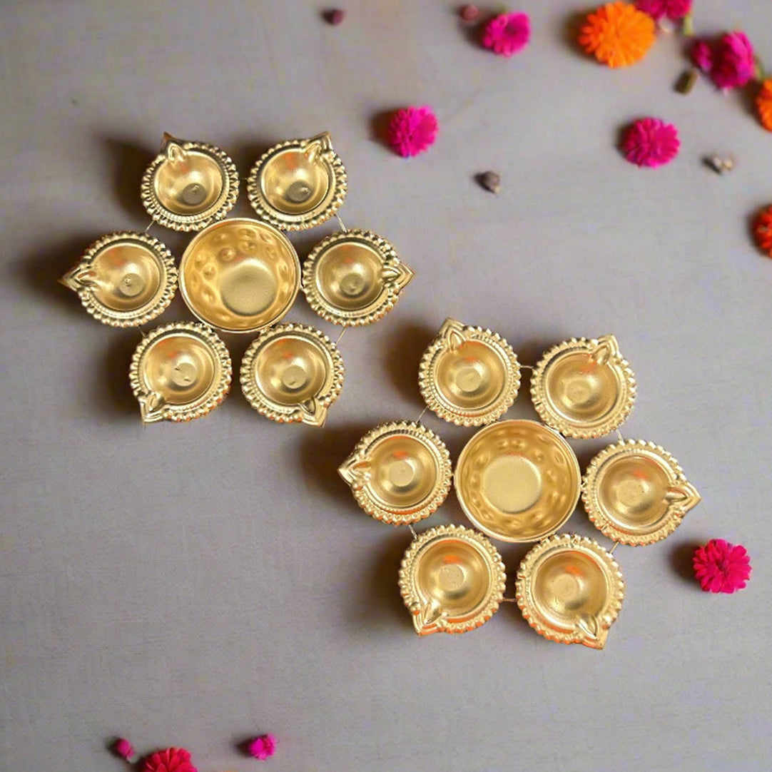 Behold the enchanting 7 Diya Floral Urli, lovingly adorned with a lustrous metallic gold finish! This artistic masterpiece is a testament to the impeccable craftsmanship of our esteemed national artisans.