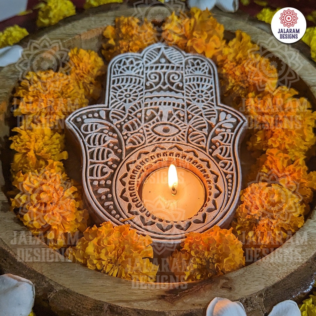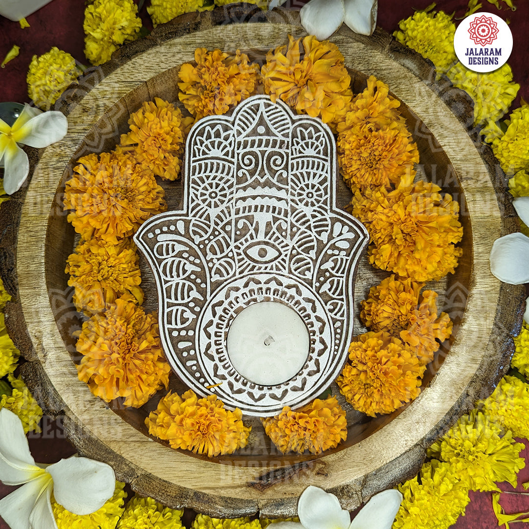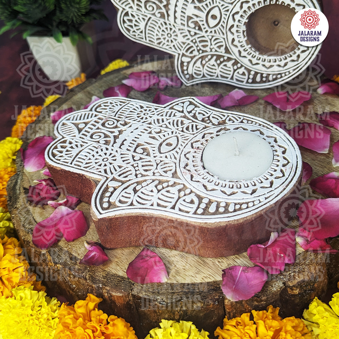 Hamsa Hand Shaped Wooden Block Tea Light Holder