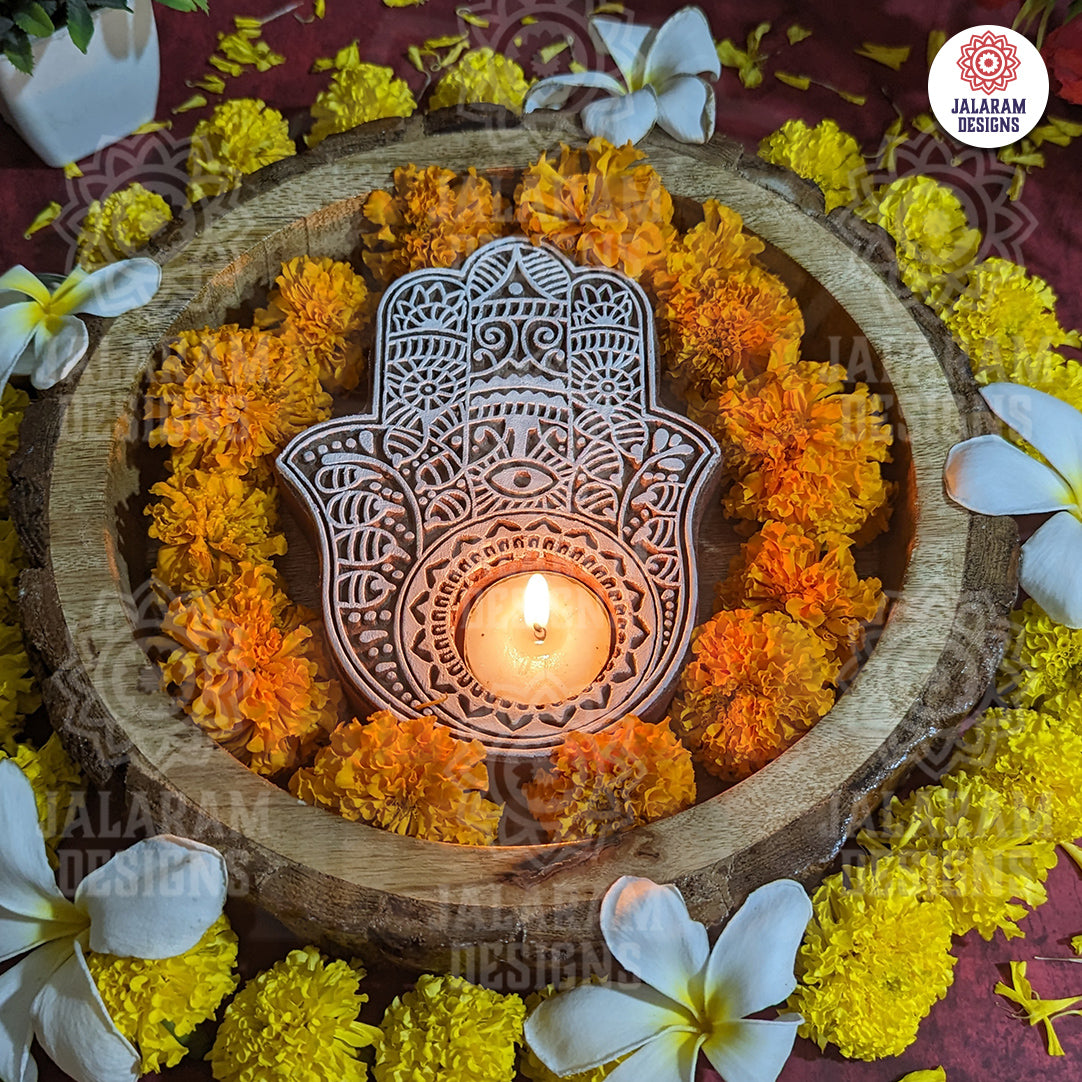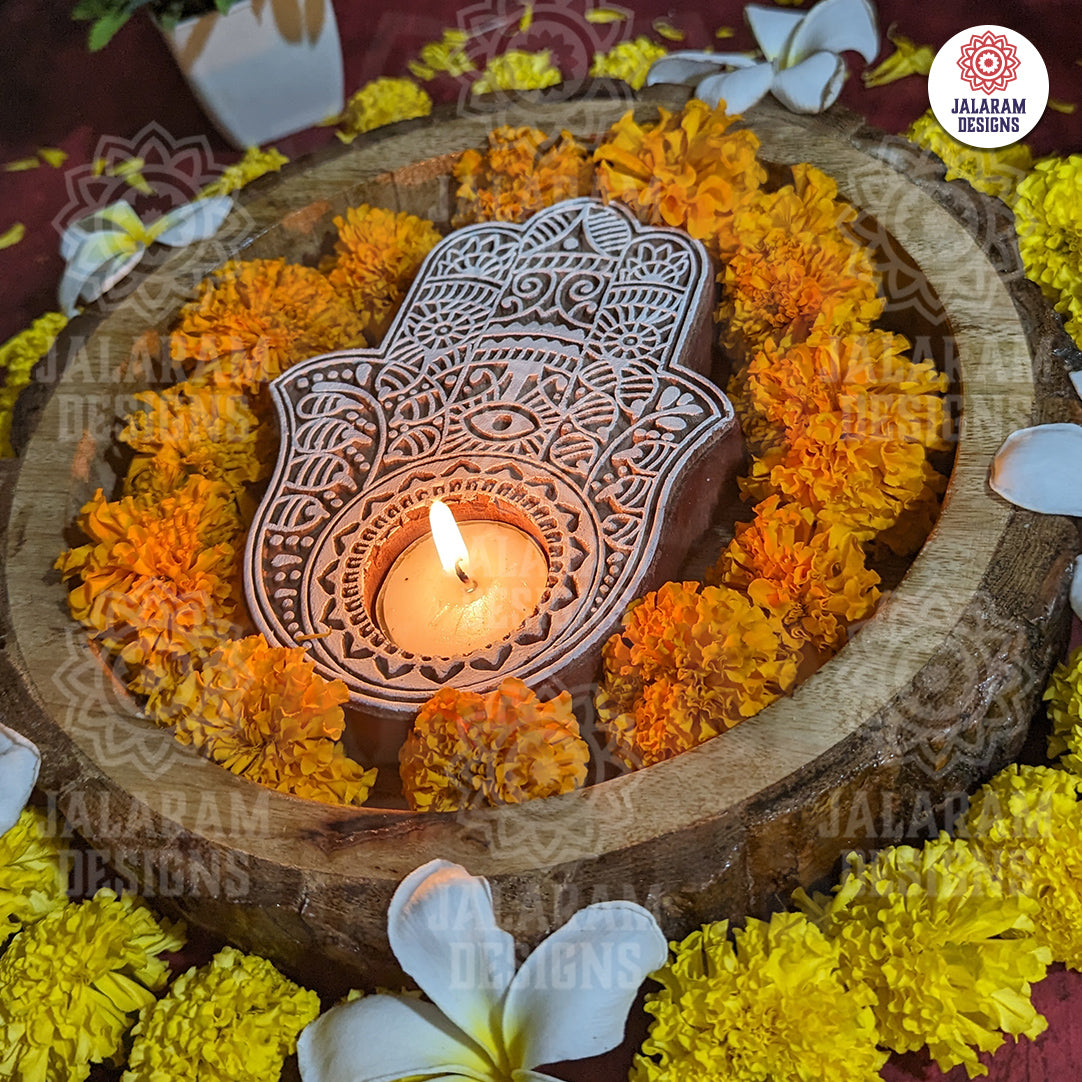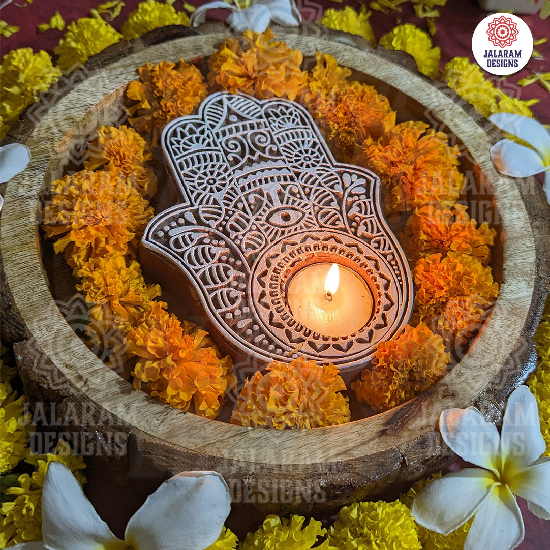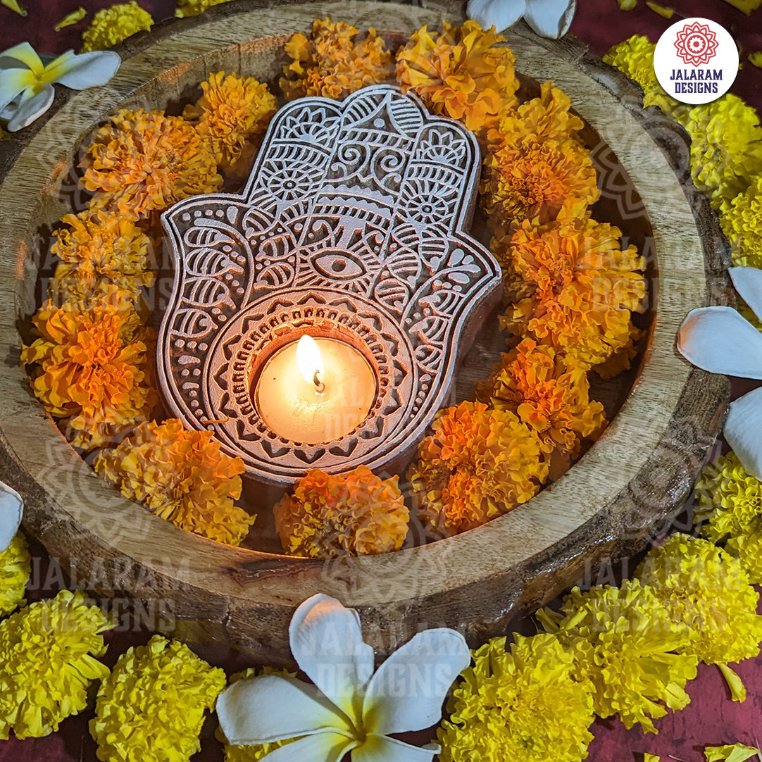 Hamsa Hand Shaped Wooden Block Tea Light Holder