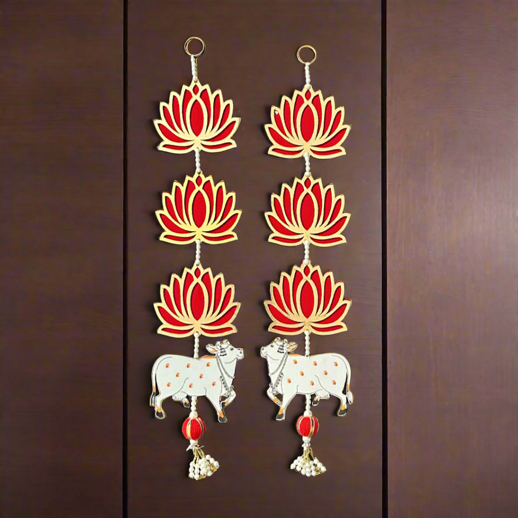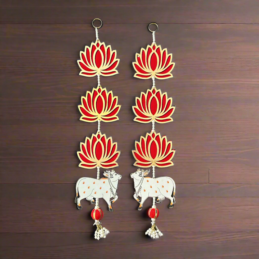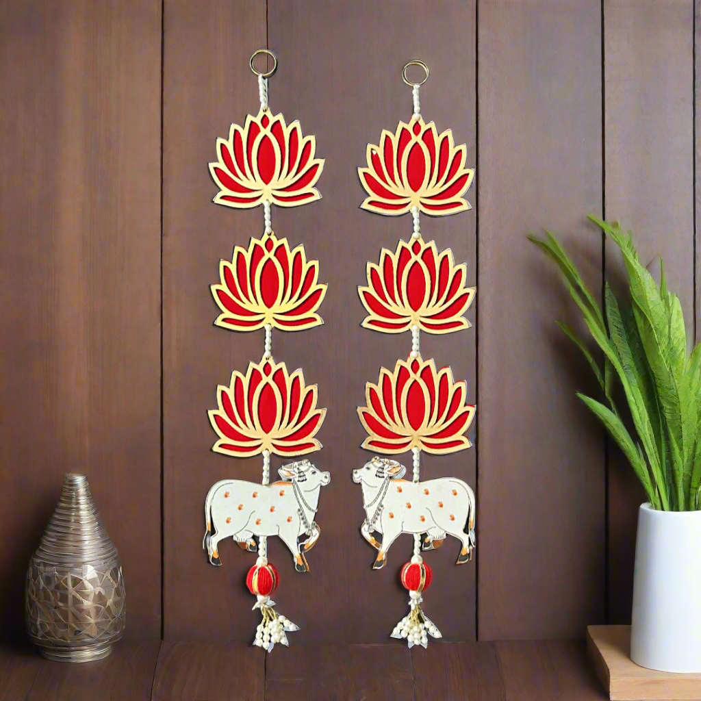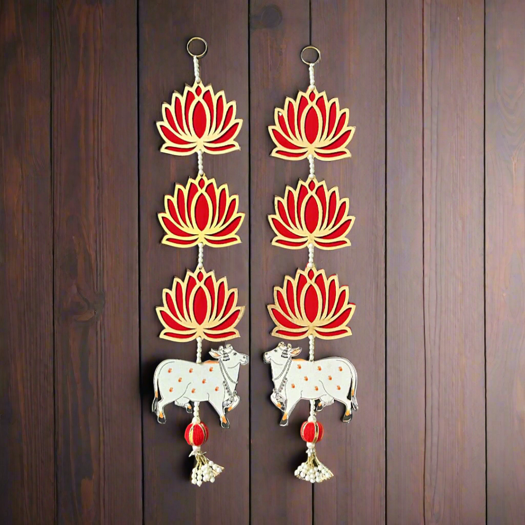 - 3 tier Set of 2 handmade lotus shape Jhumki Hanging latkans with cow for decoration of your home , you can place these beautiful hangings on your doorstep , temple back side of god idol, and living room , it will spread happiness around you.