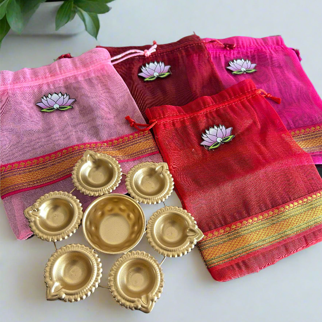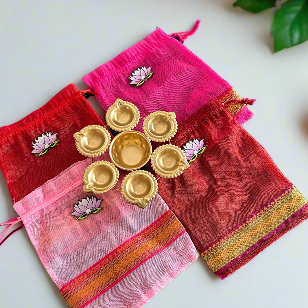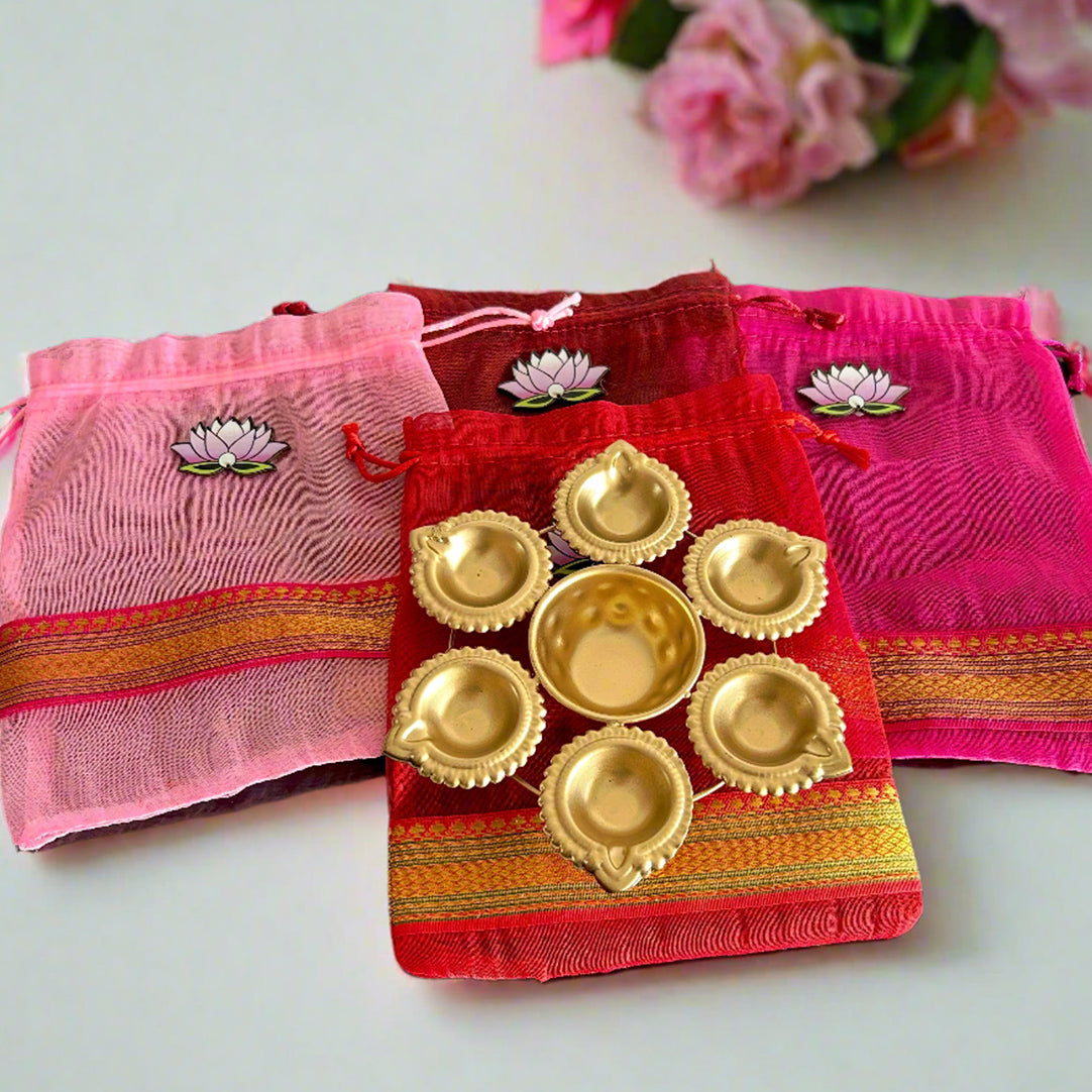Lotus Cut Brocade Border Potli Bag with Diya Urli