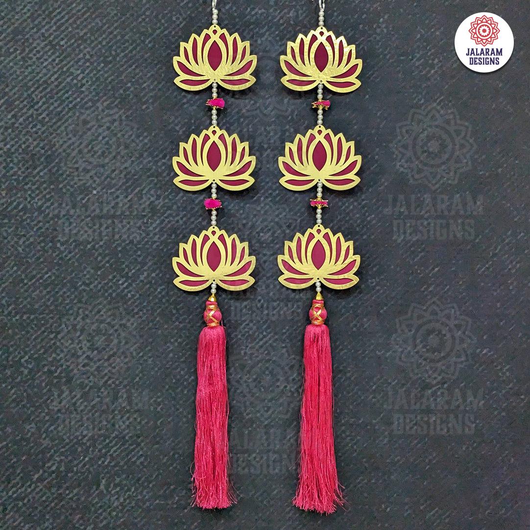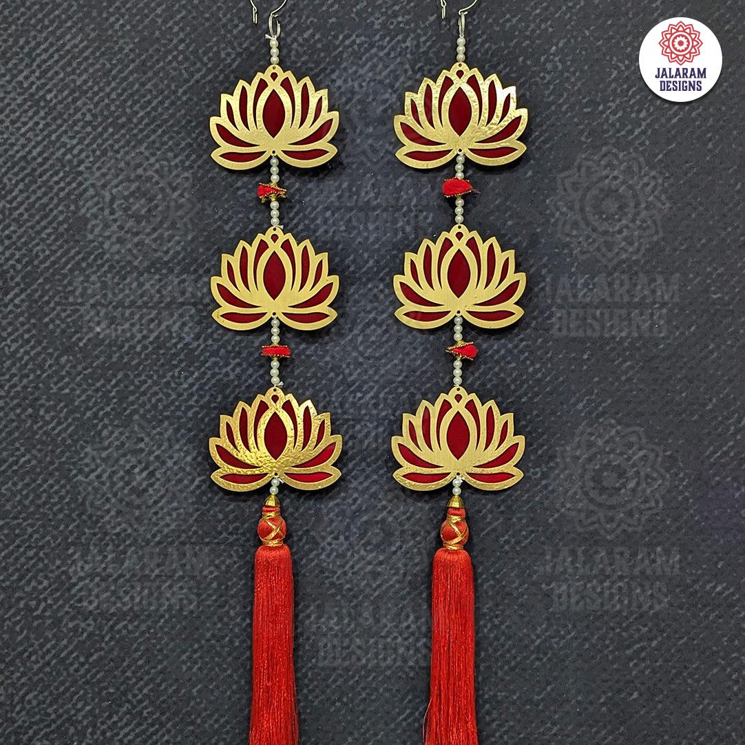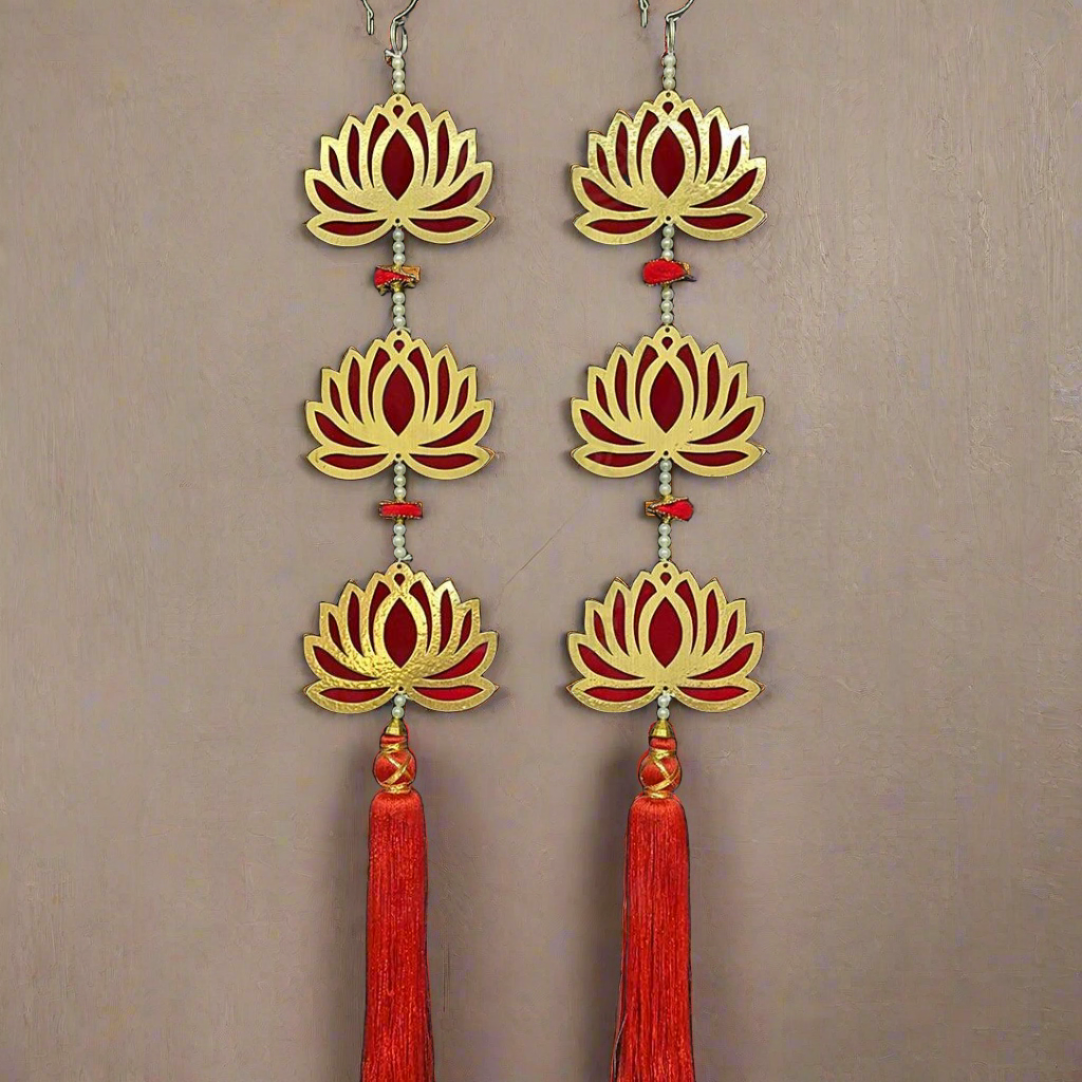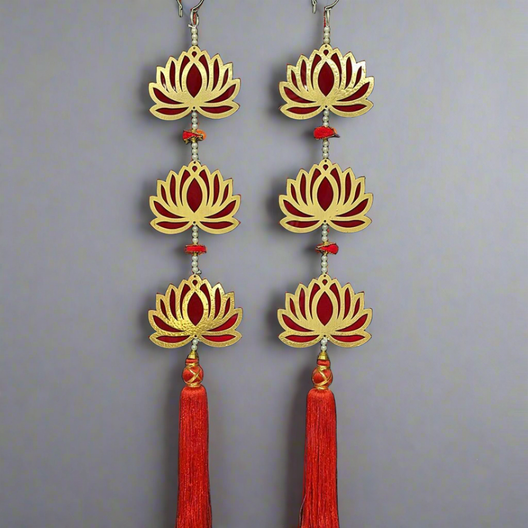 Each hanging has three carefully made lotus flowers in rich maroon and gold colours spaced out along the string at even intervals. The intricate details of the lotus petals and the glinting gold accents give your decor a sense of beauty and grace.