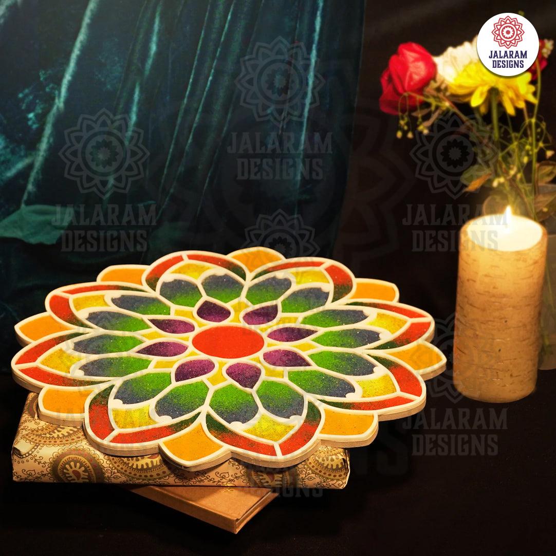 Versatile in use, it serves as a captivating Center Piece on Tables, a base for Aromatic Candles or Diffusers, a deity center placement pad in homes or offices, a welcoming entrance rangoli, or even a floating element in an Urli Bowl or swimming pool.