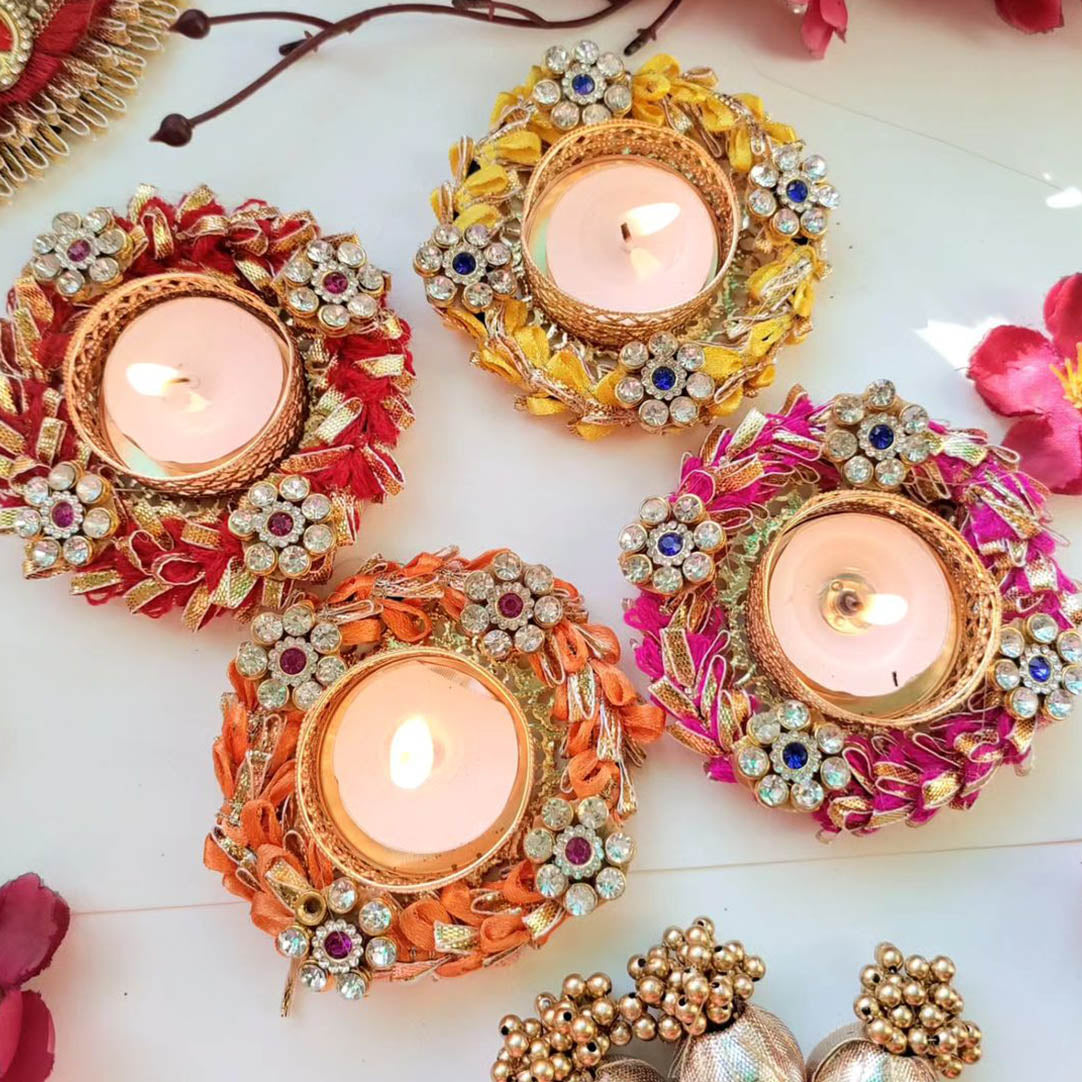 - Gottapatti And Diamond tea light holder with gotta work trimmings around the base.