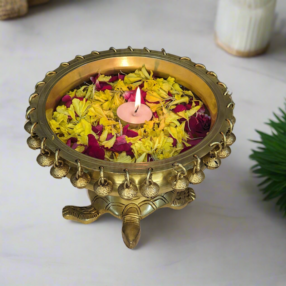 Made from premium quality brass, this Turtle Urli features intricate details and traditional good luck symbols, radiating an aura of wealth and happiness. Its elegant craftsmanship lends a unique touch to the interiors of your home, adding a touch of sophistication to any space.