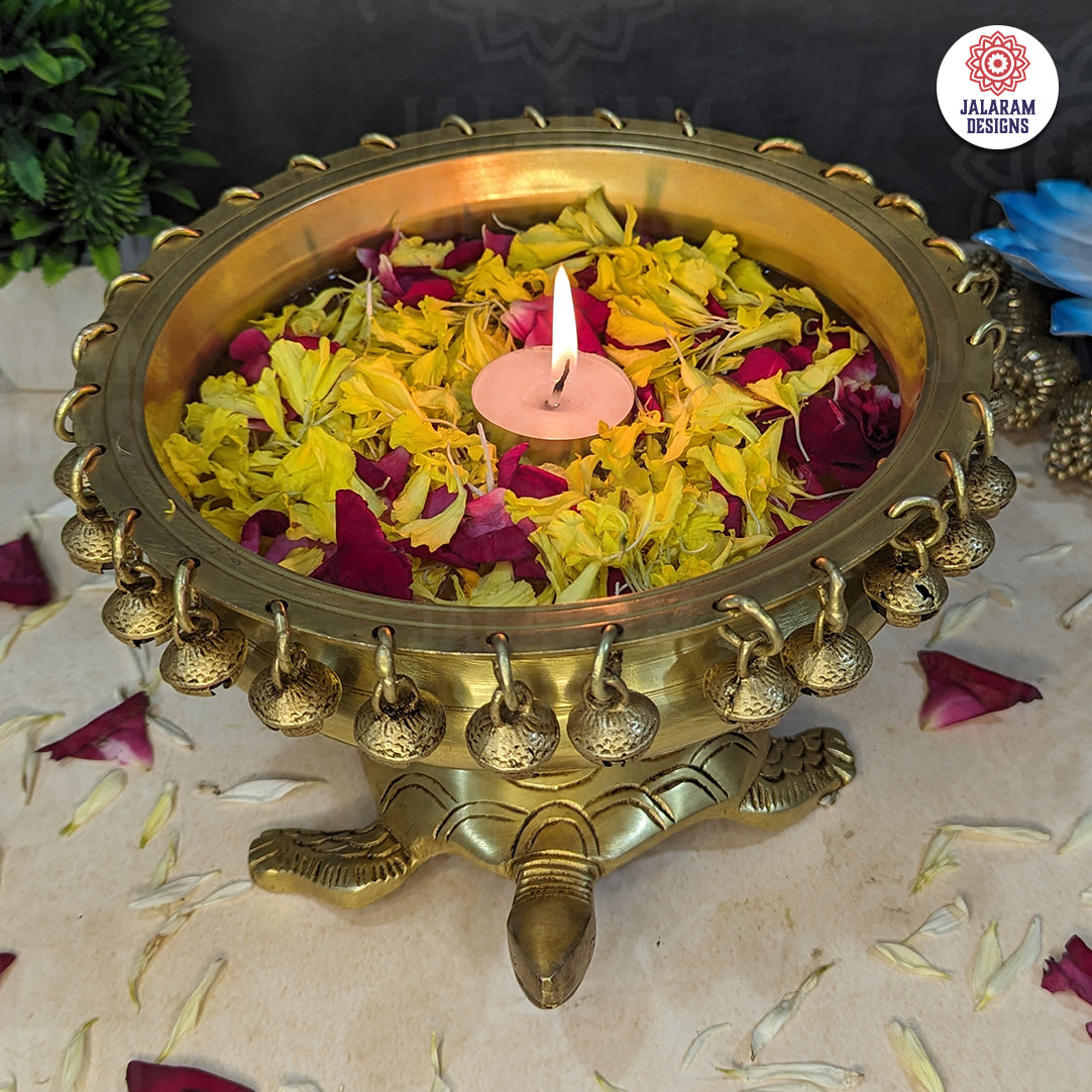 Versatile and appealing, this Turtle Urli can be placed effortlessly in any corner of your house or office, serving as a striking decorative piece. The hanging bells further enhance their visual charm, creating a soothing ambience.