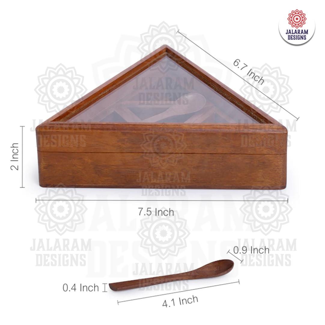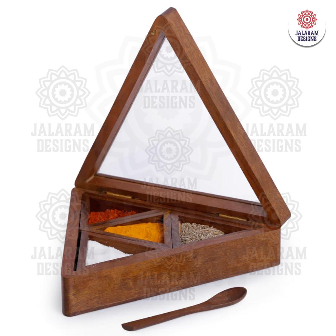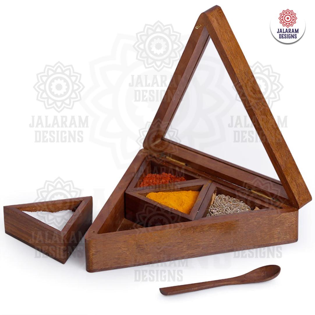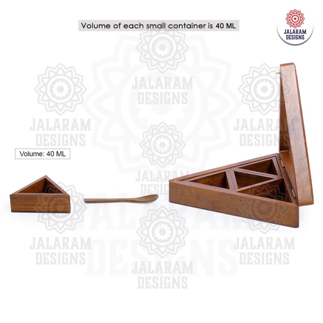 Introducing our exquisite Wooden Handmade Masala Box in captivating brown color. This meticulously crafted triangular box is a true masterpiece, designed to enhance the aesthetic appeal of your kitchen or dining area. With its innovative design, featuring four detachable triangle containers, it offers a perfect blend of style and functionality, ideal for storing spices, jewelry, and an array of other cherished items.