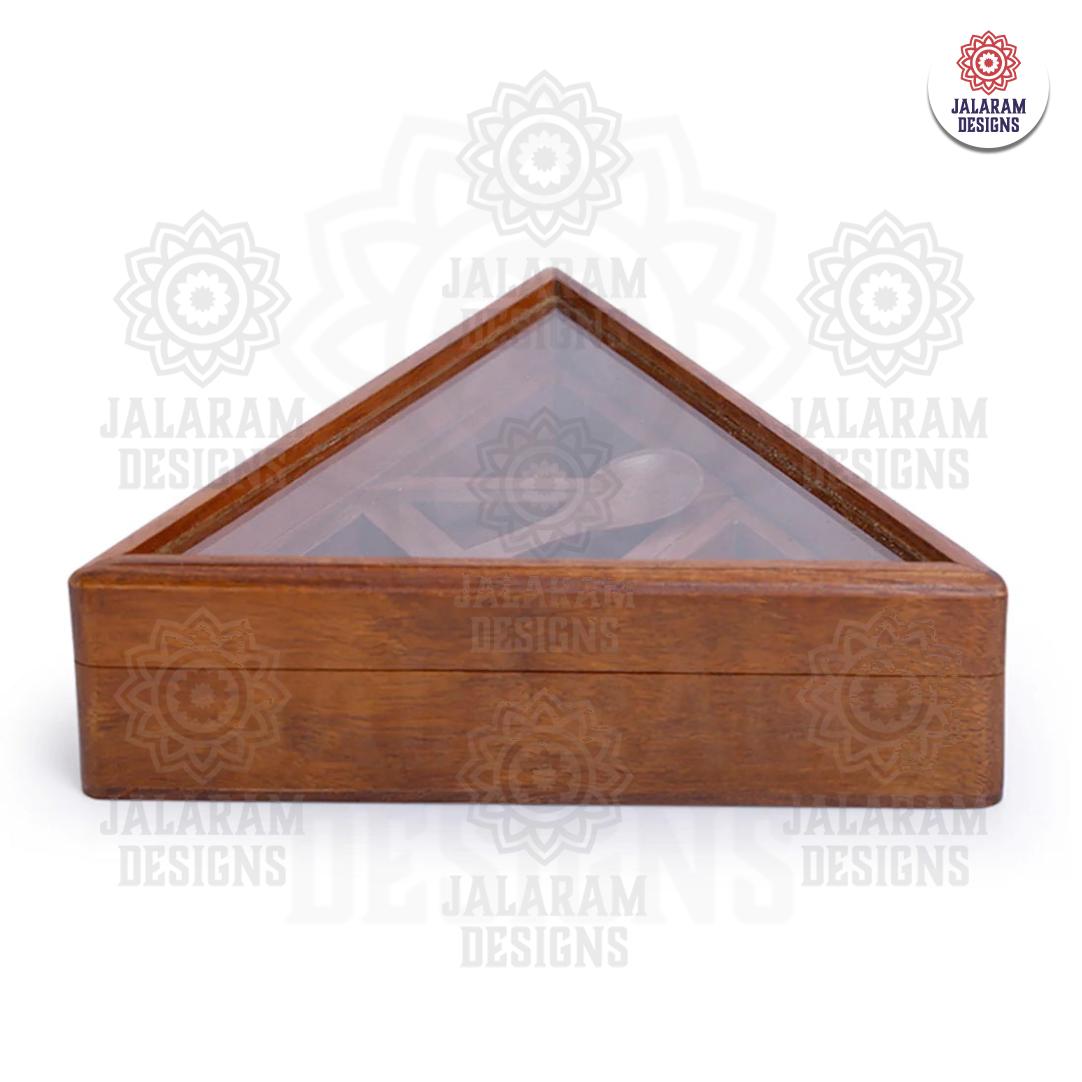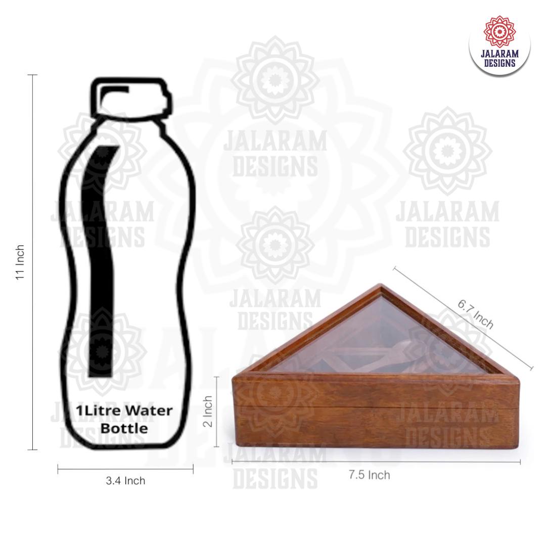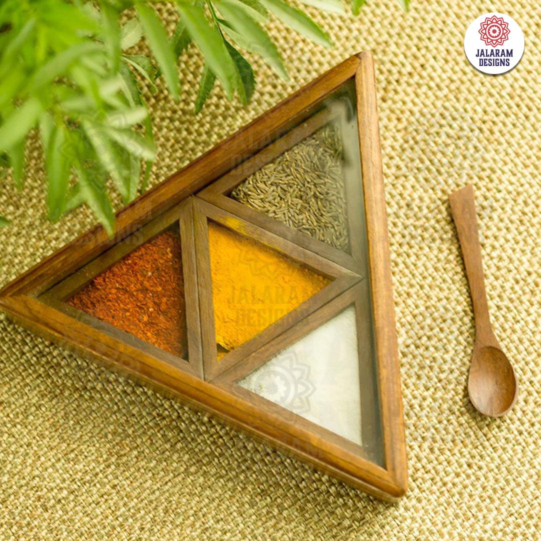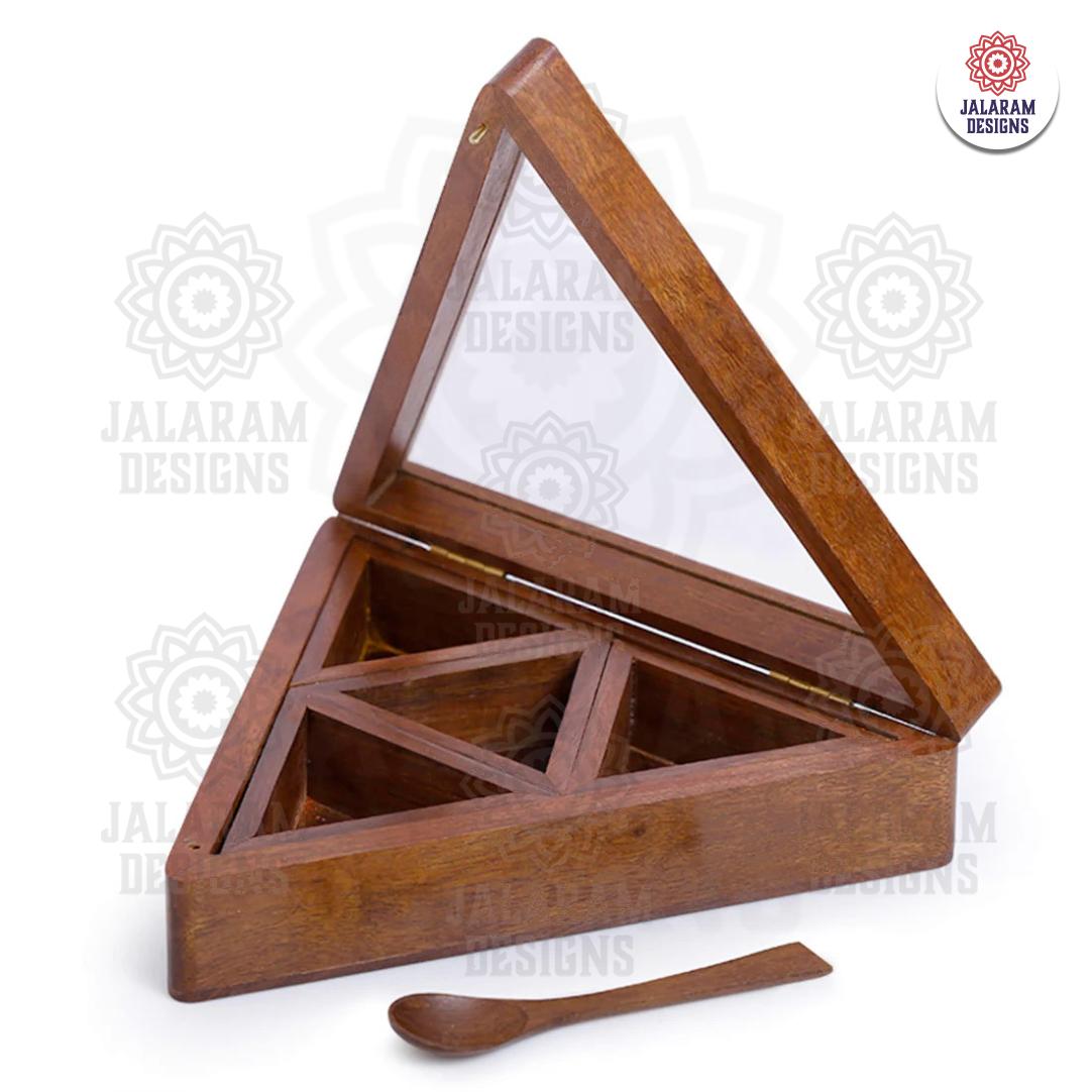 Introducing our exquisite Wooden Handmade Masala Box in captivating brown color. This meticulously crafted triangular box is a true masterpiece, designed to enhance the aesthetic appeal of your kitchen or dining area. With its innovative design, featuring four detachable triangle containers, it offers a perfect blend of style and functionality, ideal for storing spices, jewelry, and an array of other cherished items.