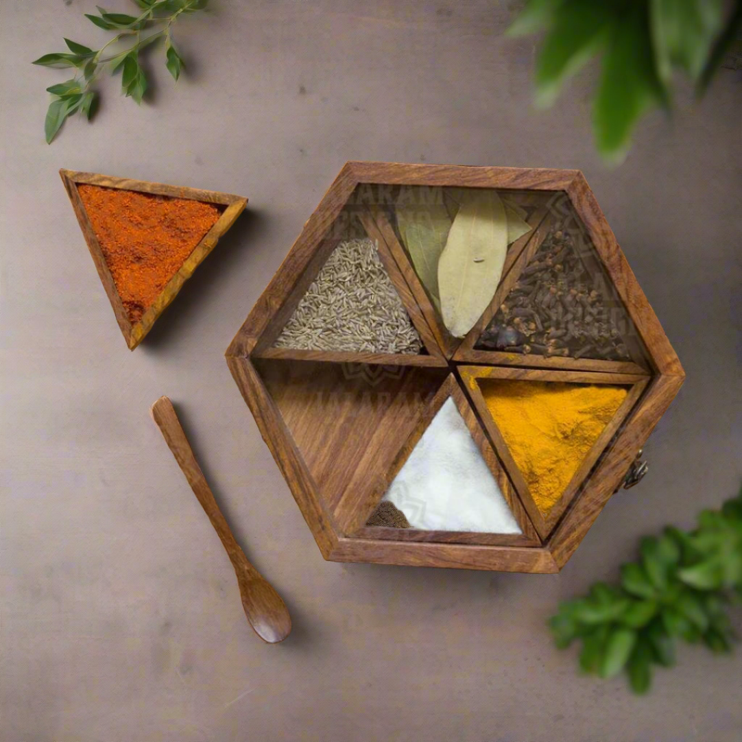 Introducing our one-of-a-kind Wooden Handmade Masala Box, a true masterpiece that combines functionality and artistry in a single creation. Carefully handcrafted with precision and love, this extraordinary brown-colored storage box will captivate your senses and elevate your kitchen experience.
