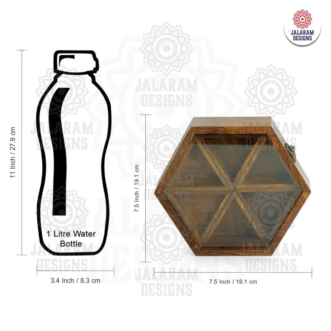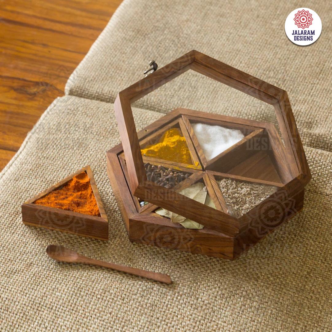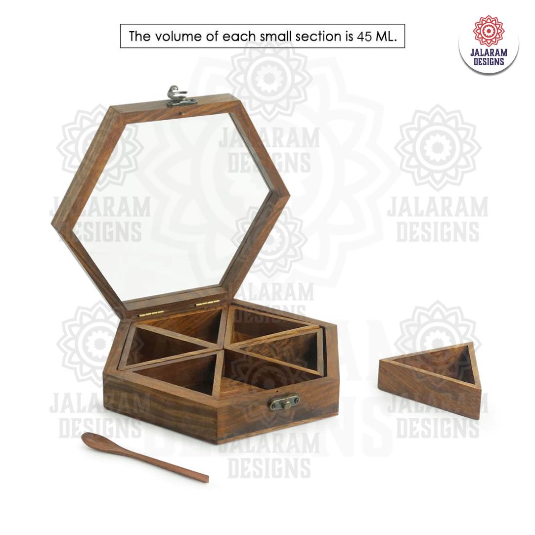 Its distinctive hexagonal shape is a symbol of perfection and balance, making it a visually striking addition to any space. The lid boasts a mesmerizing pattern, showcasing the artistry of the skilled craftsmen behind its creation. Open the lid, and you'll discover six detachable containers thoughtfully designed to hold your favorite spices, precious jewelry, or any small treasures you cherish.