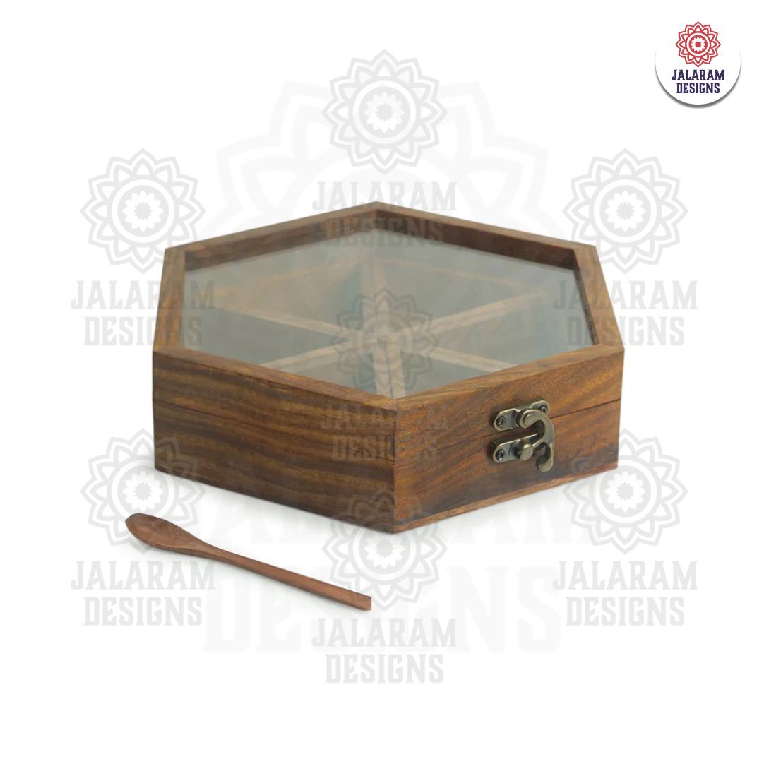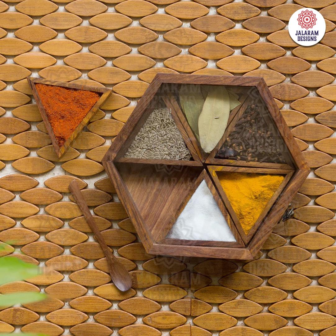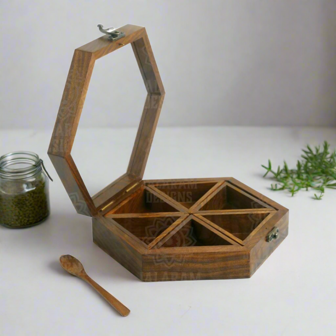Its distinctive hexagonal shape is a symbol of perfection and balance, making it a visually striking addition to any space. The lid boasts a mesmerizing pattern, showcasing the artistry of the skilled craftsmen behind its creation. Open the lid, and you'll discover six detachable containers thoughtfully designed to hold your favorite spices, precious jewelry, or any small treasures you cherish.